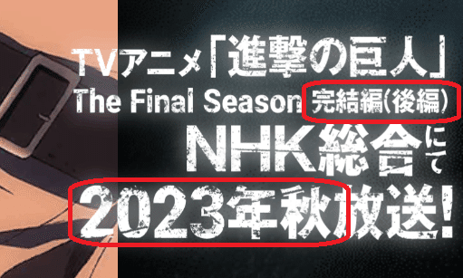 Web TVアニメ進撃の巨人The Final Season完結編後編NHK総合にて2023年放送 放送日時は決まり次第お知らせいたします 進撃の巨人特別. Web 2 days agoTVアニメ進撃の巨人 The Final Season完結編後編NHK 総合にて2023年秋放送決定 スタッフ原作諫山 創別冊少年マガジン講談社監督.